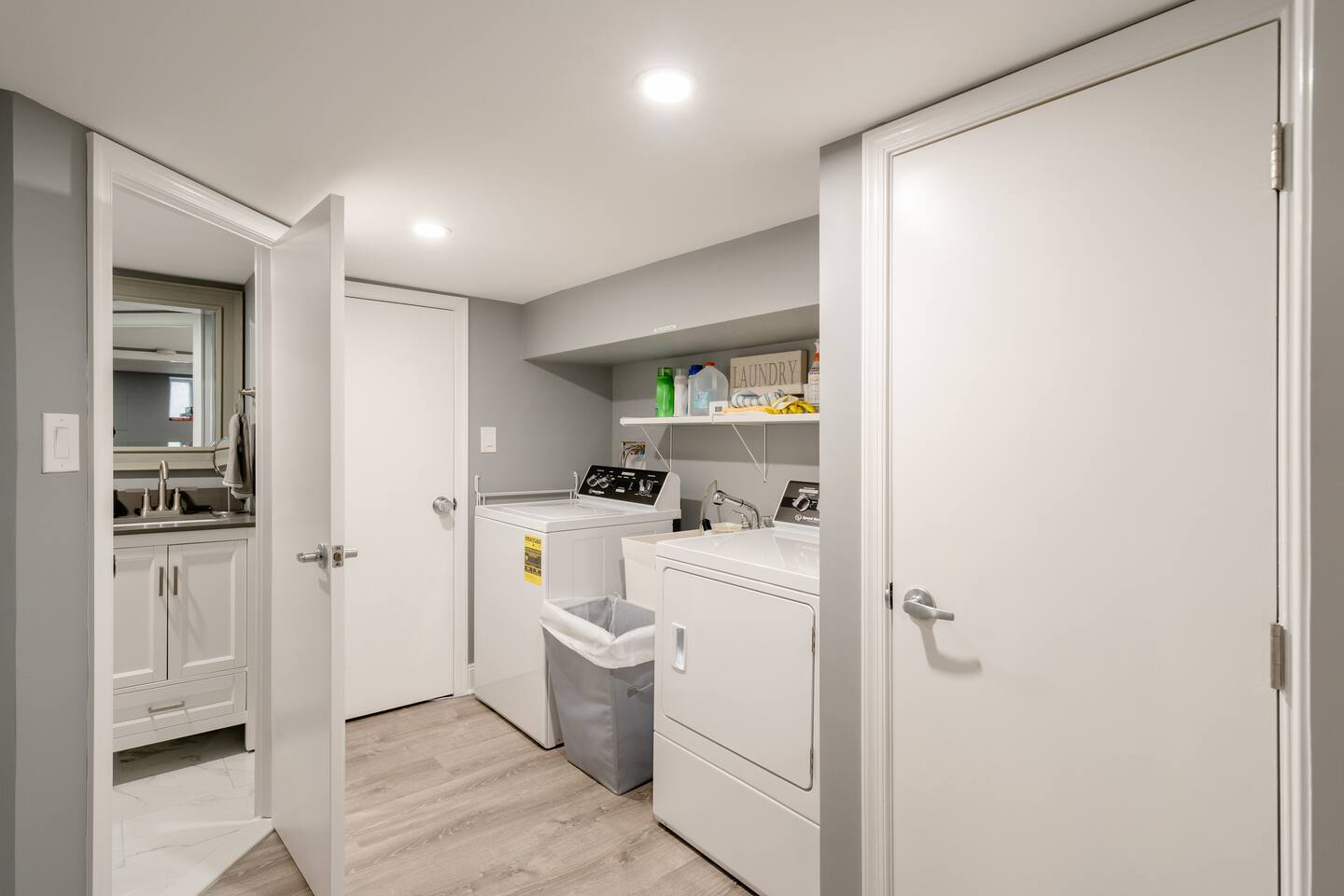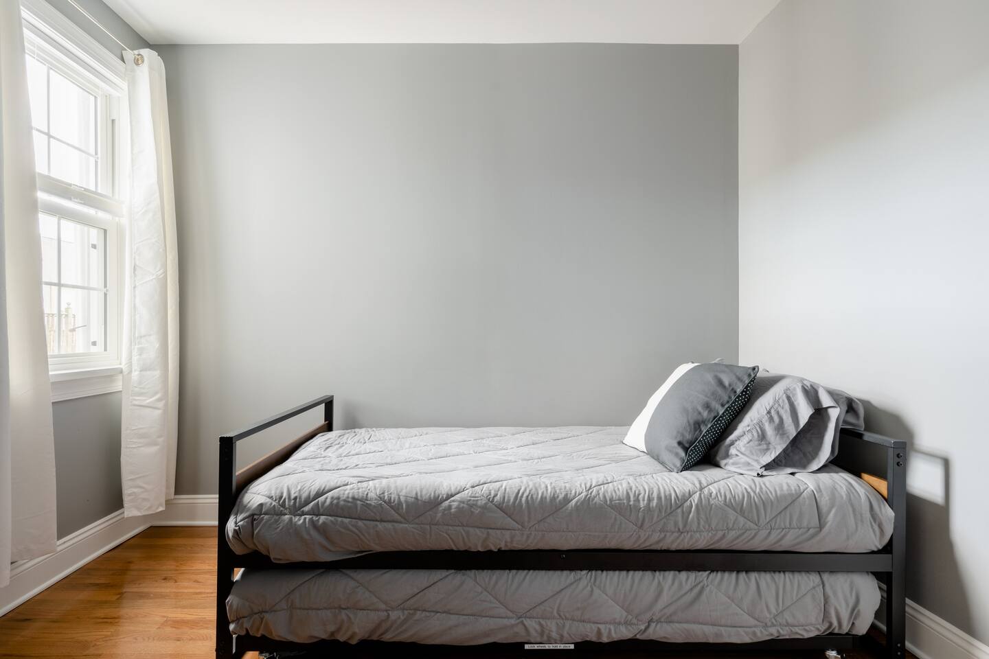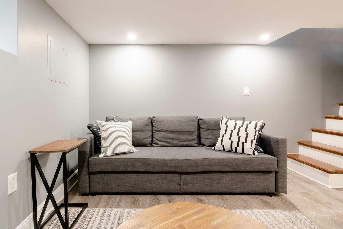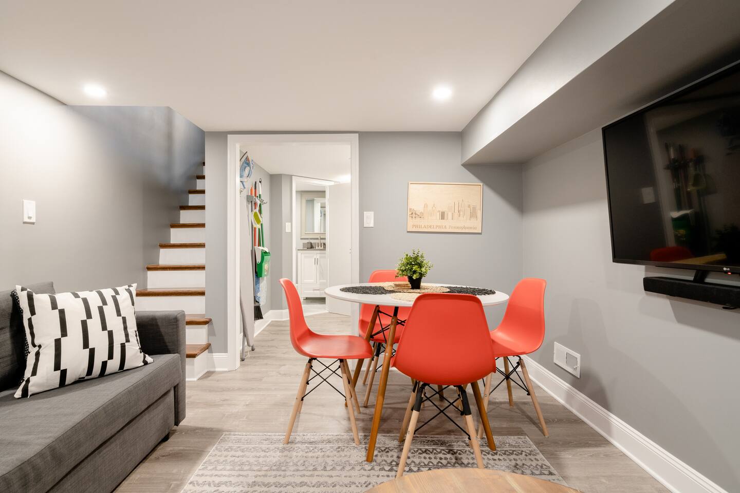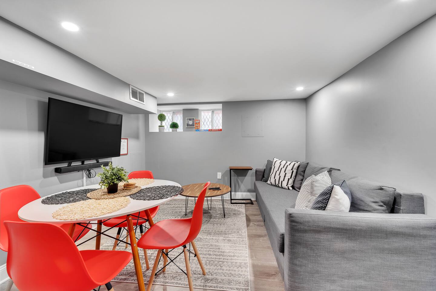 The home is furnished with a mid-century modern (MCM) style and has 3 bedrooms and 1.5 bathrooms, a finished basement with a laundry room snd the family room, and a backyard patio with outdoor seating. Look through the photo gallery for the floor plan. When you enter through the front door, you enter the living room. The living room is furnished with a couch that seats three people, two armchairs, and a coffee table. There is a 50-inch flat-screen smart TV with a sound bar mounted to the wall over a floating entertainment center. The living room is also equipped with an amazon echo smart speaker and a nest thermostat. The kitchen is next to the living room at the back of the first floor. The breakfast bar is furnished with four wooden bar stools. The kitchen has stainless steel appliances along with a coffee maker, a toaster, a blender, and an instant pot. Through the backdoor, you will have access to the backyard patio with a four-seat outdoor dining table. Down the stairs from the kitchen, there is a finished basement where you will find the family room furnished with a couch that can seat four people another 50-inch TV with a sound bar along with a round dining table that can seat four people. For your entertainment, there are several board games that you may enjoy. The basement also includes the half-bath powder room along with the laundry room. The top level of the home has the full bathroom and three bedrooms, each of which will comfortably sleep two people. The primary bedroom has a queen-sized bed. The secondary bedroom has a full-sized bed and a desk with a desk lamp. The smallest bedroom has a trundle bed with two single beds. The bottom bed is a pull-out bed with locking wheels.