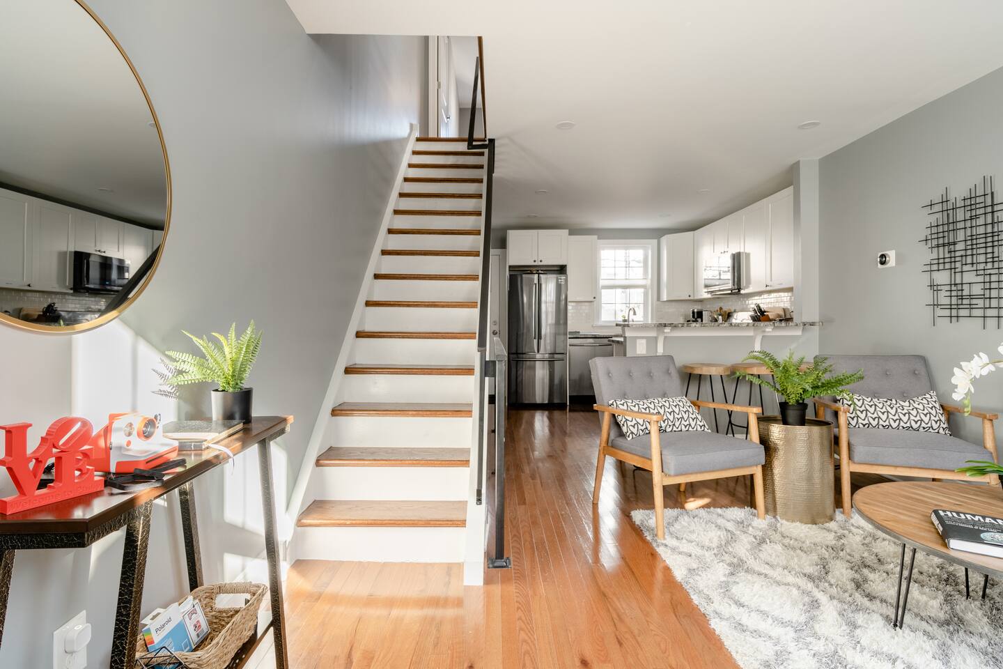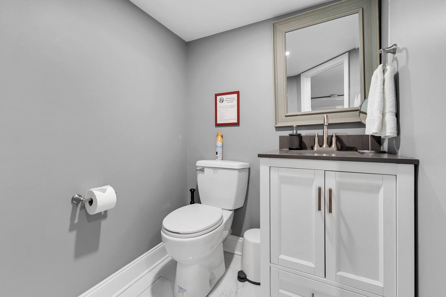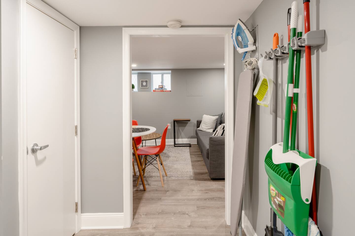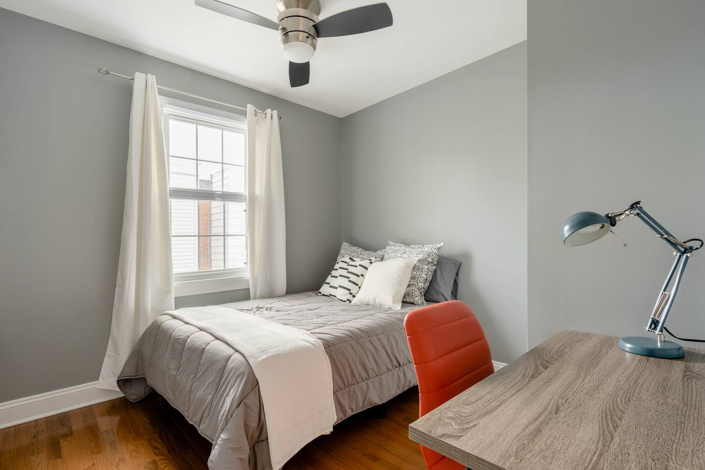 The home is furnished with a mid-century modern (MCM) style and has 3 bedrooms and 1.5 bathrooms, a finished basement with a laundry room snd the family room, and a backyard patio with outdoor seating. Look through the photo gallery for the floor plan. When you enter through the front door, you enter the living room. The living room is furnished with a couch that seats three people, two armchairs, and a coffee table. There is a 50-inch flat-screen smart TV with a sound bar mounted to the wall over a floating entertainment center. The living room is also equipped with an amazon echo smart speaker and a nest thermostat. The kitchen is next to the living room at the back of the first floor. The breakfast bar is furnished with four wooden bar stools. The kitchen has stainless steel appliances along with a coffee maker, a toaster, a blender, and an instant pot. Through the backdoor, you will have access to the backyard patio with a four-seat outdoor dining table. Down the stairs from the kitchen, there is a finished basement where you will find the family room furnished with a couch that can seat four people another 50-inch TV with a sound bar along with a round dining table that can seat four people. For your entertainment, there are several board games that you may enjoy. The basement also includes the half-bath powder room along with the laundry room. The top level of the home has the full bathroom and three bedrooms, each of which will comfortably sleep two people. The primary bedroom has a queen-sized bed. The secondary bedroom has a full-sized bed and a desk with a desk lamp. The smallest bedroom has a trundle bed with two single beds. The bottom bed is a pull-out bed with locking wheels.