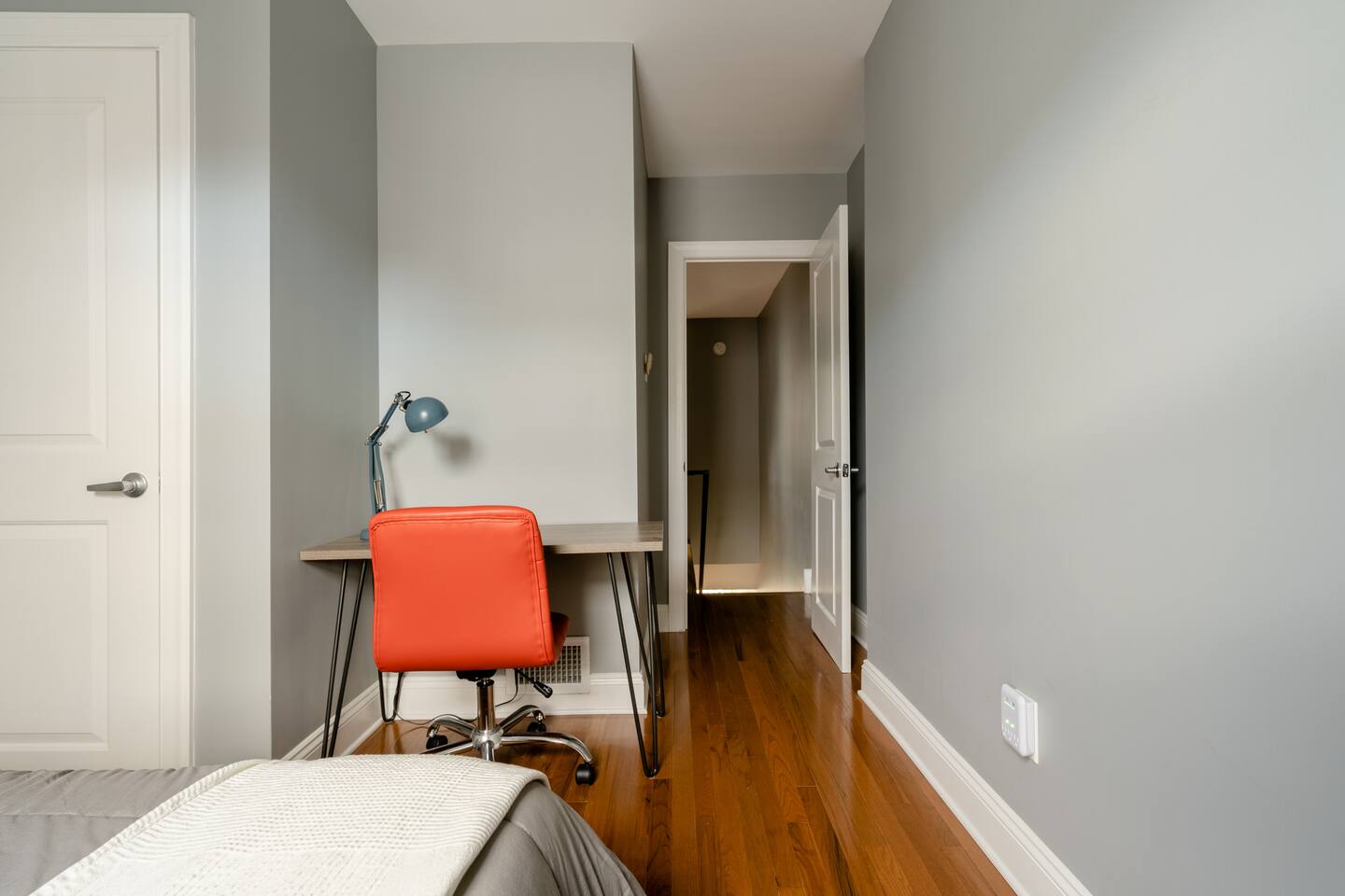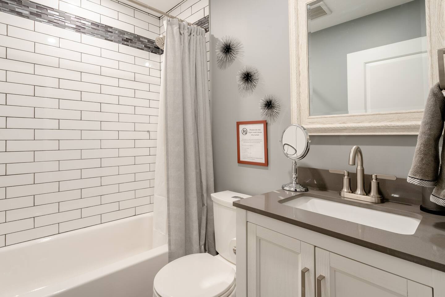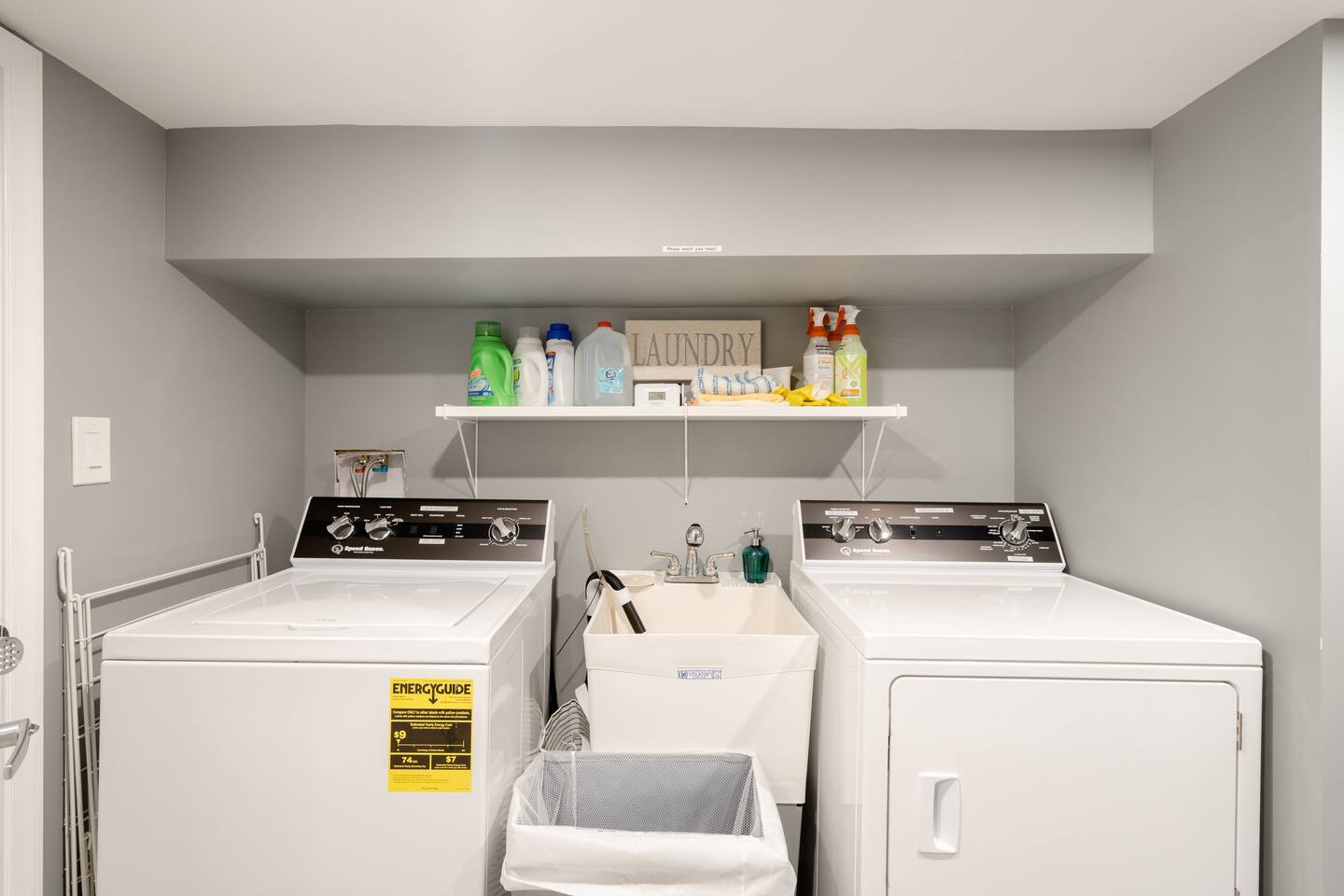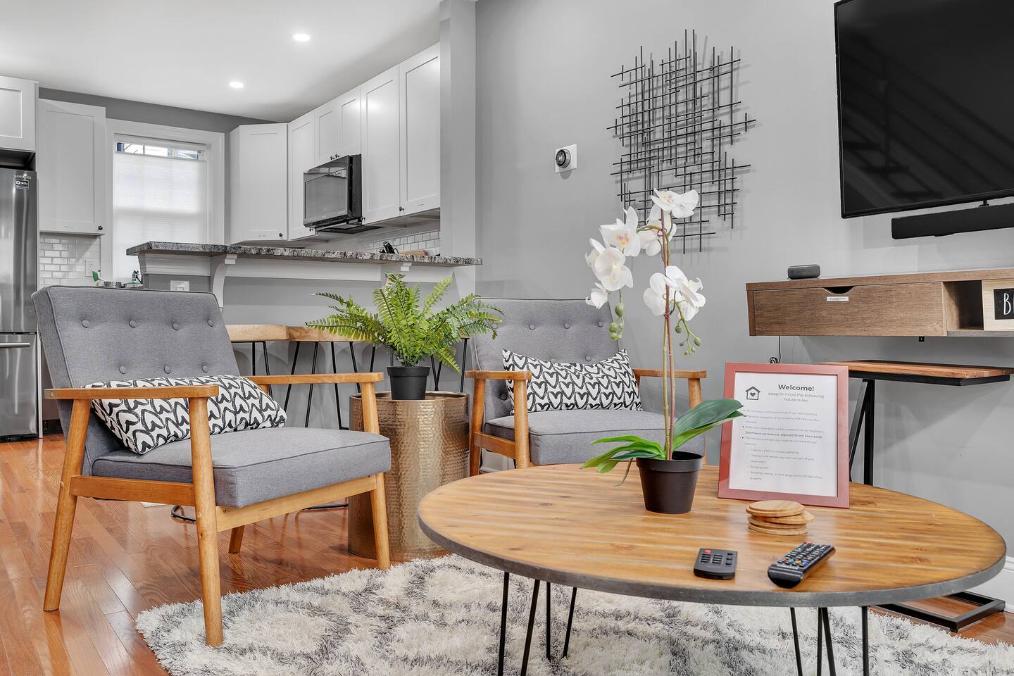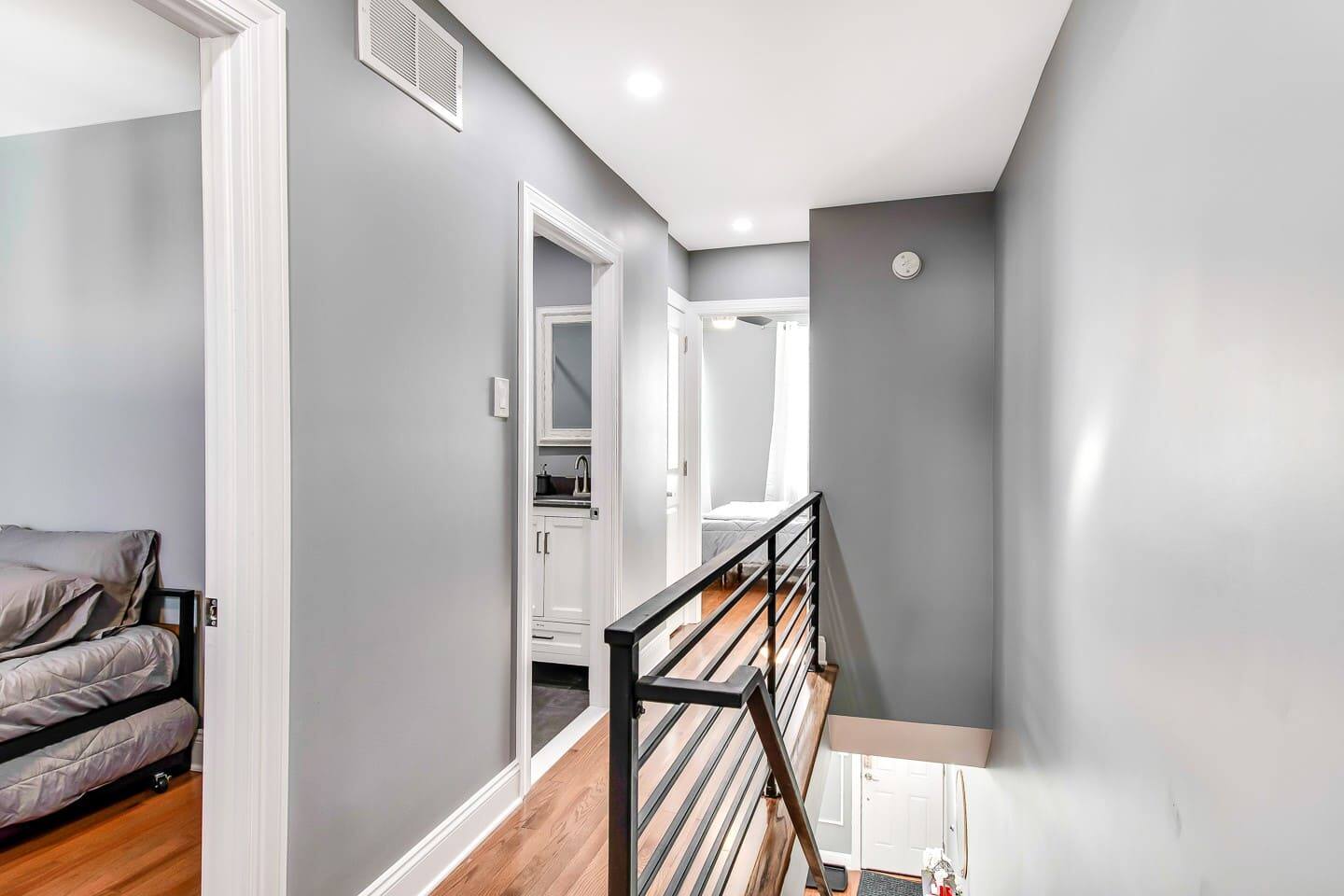 The home is furnished with a mid-century modern (MCM) style and has 3 bedrooms and 1.5 bathrooms, a finished basement with a laundry room snd the family room, and a backyard patio with outdoor seating. Look through the photo gallery for the floor plan. When you enter through the front door, you enter the living room. The living room is furnished with a couch that seats three people, two armchairs, and a coffee table. There is a 50-inch flat-screen smart TV with a sound bar mounted to the wall over a floating entertainment center. The living room is also equipped with an amazon echo smart speaker and a nest thermostat. The kitchen is next to the living room at the back of the first floor. The breakfast bar is furnished with four wooden bar stools. The kitchen has stainless steel appliances along with a coffee maker, a toaster, a blender, and an instant pot. Through the backdoor, you will have access to the backyard patio with a four-seat outdoor dining table. Down the stairs from the kitchen, there is a finished basement where you will find the family room furnished with a couch that can seat four people another 50-inch TV with a sound bar along with a round dining table that can seat four people. For your entertainment, there are several board games that you may enjoy. The basement also includes the half-bath powder room along with the laundry room. The top level of the home has the full bathroom and three bedrooms, each of which will comfortably sleep two people. The primary bedroom has a queen-sized bed. The secondary bedroom has a full-sized bed and a desk with a desk lamp. The smallest bedroom has a trundle bed with two single beds. The bottom bed is a pull-out bed with locking wheels.